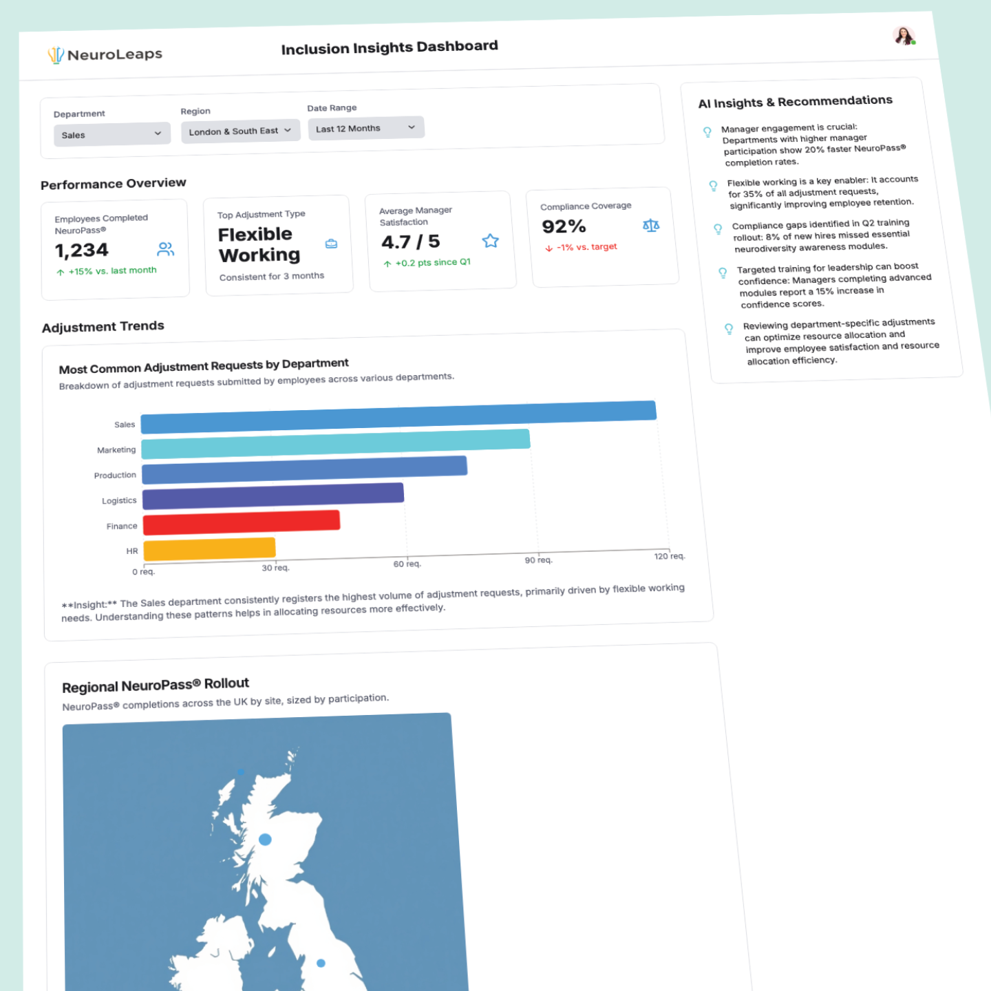 NeuroPass® has been designed from the ground up to align with UK Equality Act and data protection standards, giving HR teams confidence that neurodiversity data is handled lawfully and respectfully. It creates an auditable record of workplace adjustments, ensures consistency across departments, which reduces the compliance risks of informal or undocumented support practices.